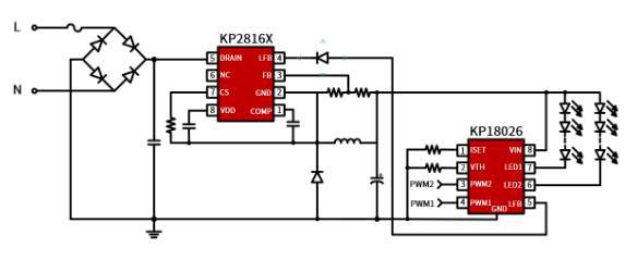 KP18026 是一款双通道调光调色线性恒流驱动芯片。专利技术的 Link-DimTM 构建自适应高 PF LED 驱动架构,前级采用高 PF 自适应恒定电压控制的降压变换器,后级采用 KP18026 实现恒定输出电流,调光控制以及反馈 LED 电压给前级调整适合的输出电压等功能,具有系统成本低,效率高,以及输出无低频纹波的特点。 KP18026 具有两个独立通道的 PWM 调光功能,支持调光调色功能,每通道可实现 1%~99% 的调光范围,以及在最小调光时能达到 ±10% 的调光精度,可以保证在整个调光范围内,光源具有较好的光色一致性。 KP18026 内部集成 LED 开路保护,LED 短路保护和过温保护功能。另外,为了保障因 RISET 电阻意外短路而造成 LED 超过额定电流,KP18026 内部还集成 ISET 短路保护,降低输出电流到最小调光状态。这些保护保障了系统的安全可靠。 |