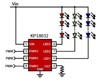KP18032 是一款高精度的 3 路线性 LED 调光驱动,可通过 3 个 PWM 接口独立设置 3 个通道的 PWM 信号占空比,实现调光调色功能。KP18032 采用 PWM 斩波方式调光,最低调光深度可以达到 0.1% 以下。 KP18032 的 3 路 LED 通道耐压 40V,每通道最大电流 200mA。KP18032 具有较高的恒流精度,可以达到 ±5%@20mA。 KP18032 内部集成有过热保护功能,当芯片温度超过过温保护点时,芯片会自动降低输出电流,保证系统稳定性。 |
